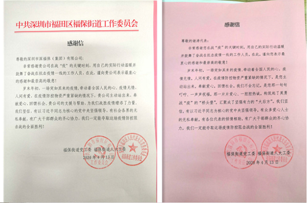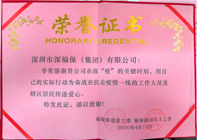 近日,福保街道党工委、福保街道人大工委向集团颁发了抗疫荣誉证书和感谢信,表彰和感谢必一运动集团及福田区人大代表、集团党委书记董事长谢涛在抗疫期间对辖区一线抗疫工作的支持和配合。市公安局交通警察局向物业公司颁发了《同舟共济以爱筑城》荣誉证书,感谢物业公司在抗疫期间对交警工作的关心与支持。
