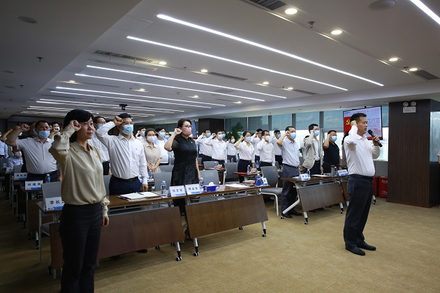 重温入党誓词环节,在王昌栋副书记的领誓下,参加活动的党员同志举起右拳,面向党旗庄严宣誓,重温入党时对党和人民作出的庄严承诺。