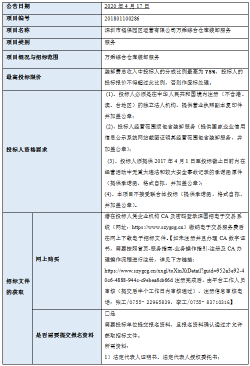 深圳市福保园区运营有限公司万乘综合仓库装卸服务项目(项目名称)招标人为深圳市福保园区运营有限公司(招标人单位名称)。项目已具备招标条件,现进行国内公开招标。