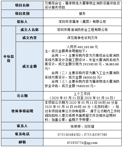 万乘综合仓、福保物流大厦等物业消防设施评估及设计服务项目已完成评审,现将本项目评审的相关情况及结果进行公示,具体内容如下: