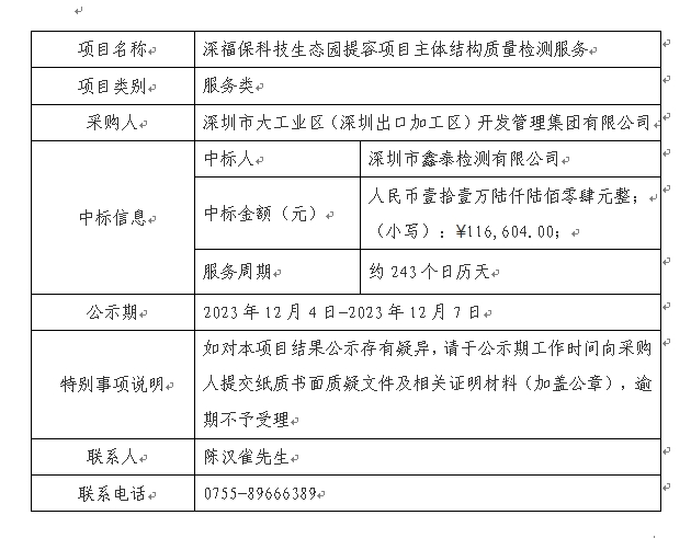 在深圳阳光采购平台进行公开招标的必一运动科技生态园提容项目主体结构质量检测服务已完成评审及定标,现将本项目评审的相关情况及定标结果进行公示,具体内容如下: