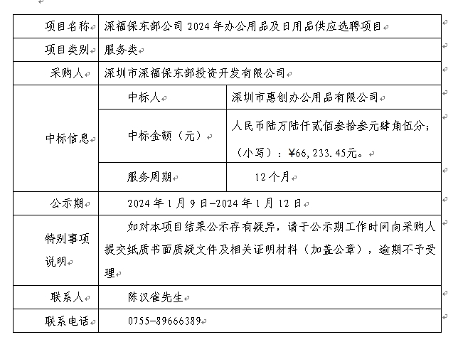 在深圳阳光采购平台进行公开招标的必一运动东部公司2024年办公用品及日用品供应选聘项目已完成评审及定标,现将本项目评审的相关情况及定标结果进行公示,具体内容如下: