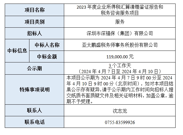 2023年度企业所得税汇算清缴鉴证报告和税务咨询服务项目已完成评审,现将本项目评审的相关情况及结果进行公示,具体内容如下: