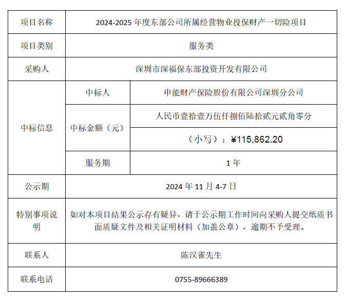 在深圳市阳光采购平台进行公开招标的2024-2025年度东部公司所属经营物业投保财产一切险项目(项目编号:241BA0269440)已完成定标,现将本项目定标结果进行公示如下: