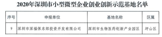 12月1日,深圳市中小企业服务局公布“2020年深圳市小型微型企业创业创新示范基地名单”,深圳市生物医药创新产业园区项目入选同时入选的还包括清华信息港、大运软件小镇等共15个园区。